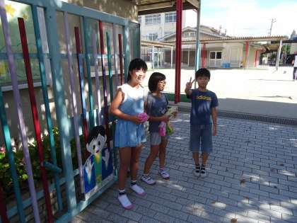 登校する児童たちに,朝の挨拶運動を行いました。PTAの役員の方々と計画委員会の児童で挨拶をしました。