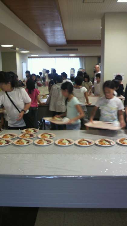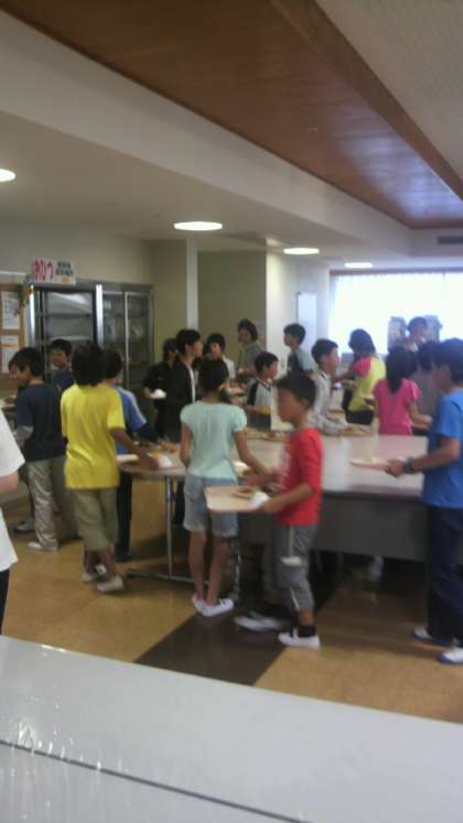 8月3日(火) 夕食の様子です。2回目の夕食となり,準備の仕方など要領を得て,班毎に「いただきます。」をして食べ始めました。