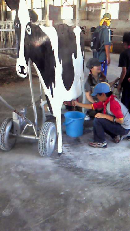 牧場体験では,搾乳ロボットを貸していただき,搾乳の模擬体験をしています。写真は,その搾乳体験と牧場の風景です。