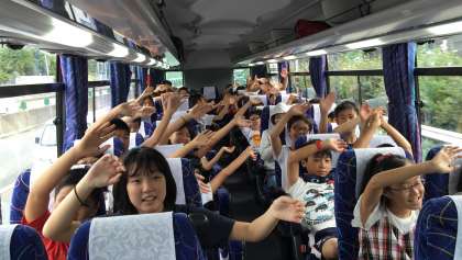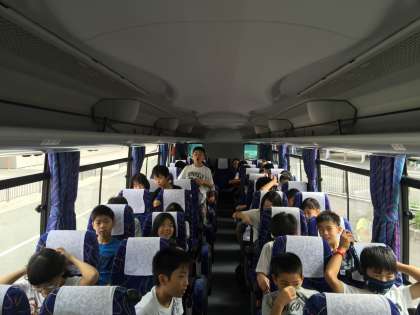 みどりの広場前からバスで出発し高速道路を走っています。 バスの中は快適です。みんな元気です。