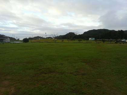2日目の朝です。昨夜未明から雨が降ったのか、地面が濡れています。少しポツポツとしていますが、空は青空が見られます。今日も元気に活動できそうです。(朝の深谷水道と芝生広場の様子です。)
