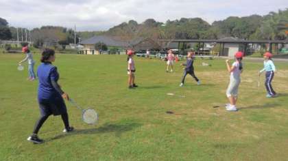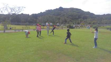 バドミントン、ソフトバレーボール、フライングディスク、アスレチック、サッカー等、好きなスポーツをしています。この後は、野外炊事をします。