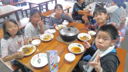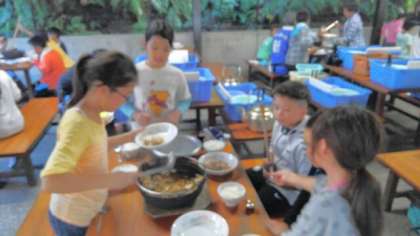 すき焼き風煮こみができ上がりました。自分達で作った料理は最高みたいで、なべがどの班も空っぽになっていました。ごちそう様でした‼さぁ、後はナイトウォークです。