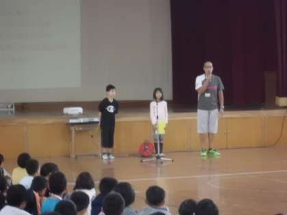 児童代表のはじめのことばの後,全員合唱でI&Uの歌唱練習をして,全校児童で2部合唱しました。その後,飼育委員会・図書委員会・給食委員会のお知らせに続いて,4年生の作文発表がありました。
