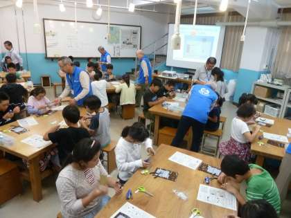 工房学習では村田製作所の“音を奏でる不思議な石ころ”を作りました。細かい部品を折り曲げたり,ホッチキスで段ボール紙に止めたりしながら,何とか完成させることができました。普段教室では体験できないようなモノづくりをすることができ,完成したときには何度も音が出るのを確かめて,ご満悦な様子の子どもたちでした。