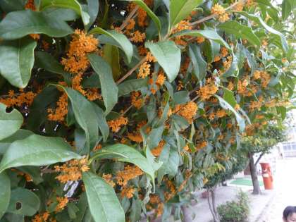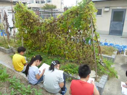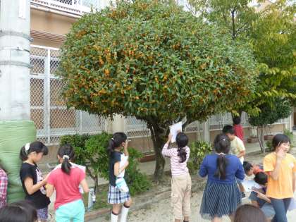 1019 4年2組 理科「季節の生き物(秋)」 公開日 2016/10/20 更新日 2016/10/20 学校の様子 夏のような気温が続いていますが,季節はすっかり秋。 夏の植物が枯れ,虫が鳴きはじめ,秋の花が咲き始めました。 今日は春や初夏から続けているサクラとツルレイシの観察をしました。 そして観察し終わった子から香りに誘われるようにキンモクセイの木へ。 今まさに満開で,3階の4年生の教室にも香りが運ばれて来ます。 素敵な香りに包まれながら,ほっと一息ついた6時間目でした。