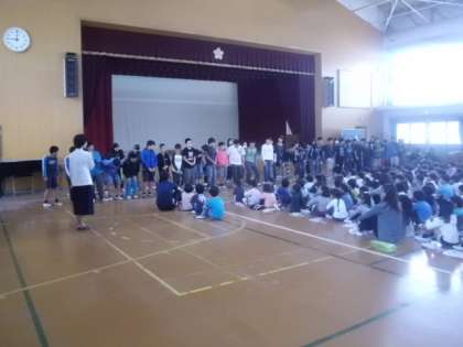 6年生は,陸上記録会で男子高跳びや女子ソフトボール投げで入賞したことを紹介し,賞状を渡しました。