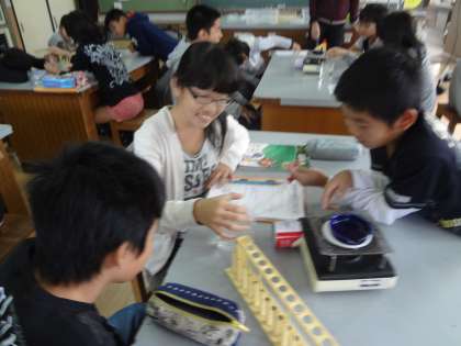 水よう液の性質の実験の様子です。 炭酸水には何がとけているのかを調べました。