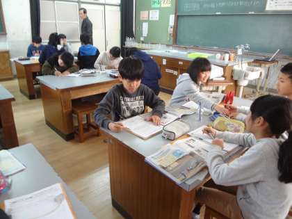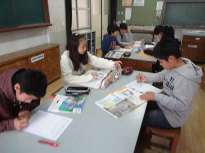 写真は,大型テレビに写された地層をワークシートへ書きうつしているところです。