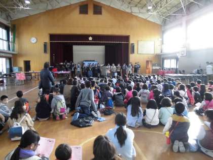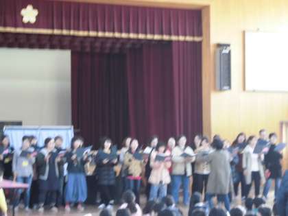 オープニングはコーラス部です。曲は「明日への手紙」「みんながみんな英雄」です。お母さん方の透き通った美しい歌声が体育館に響きました。