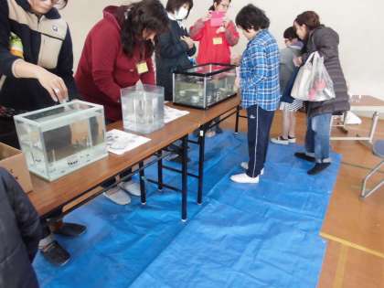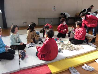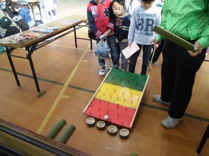 体育館のフロアーでは,女性会の方の「むかしあそび」や交通安全推進委員会コーナーや「コイン落とし」といった普段しない遊びにチャレンジしていました。