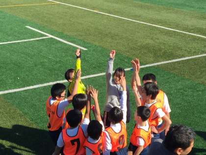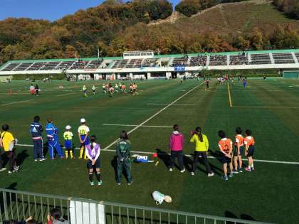11月26日に宝ヶ池球技場で開催されたタグラグビーの試合に,部活動タグラグビーで練習している明親小の子どもたちが出場しました。子どもたちは,声をかけあい頑張りました。
