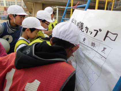 サッカーの学習も残り1時間となりました。4年1組では『4年1組明親カップ』を進めています。これまでの対戦結果を見ると,引き分けが多く,お互いの思いがぶつかり合い,熱い熱戦をくり広げています。試合では,公正な判断のもと試合を行っていけるよう対戦チーム同士で声をかけ合う場面や,味方同士でもシュートが決まった時には喜び合い,決められたときには励まし合い,良い雰囲気で取り組んでいます。試合も残り1試合!それぞれのチームのめあてが達成できるよう,力を合わせて取り組みましょう☆