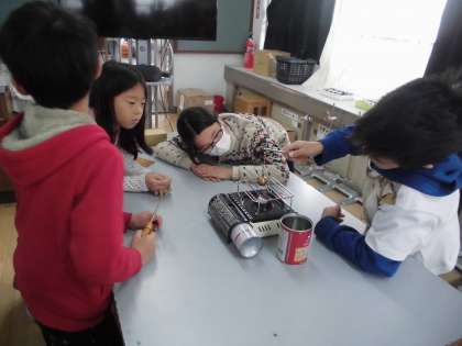 理科で『金ぞくの温度と体積』の学習をしました。金ぞくの玉が輪を通りぬけることを確かめ,ガスこんろで熱します。その後,その玉が輪をくぐりぬけることができるかどうかを調べました。思わぬ発見がいっぱい!大興奮の子どもたちでした。