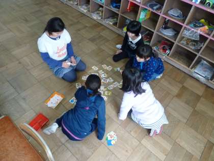 休憩時間には1組2組合同でカルタ・トランプをしたり,外へ遊びに行ったりしていました。