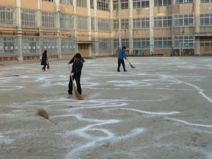 それを防ぐために,今日は教職員で凍結防止剤を撒きました。