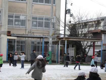 昨日の朝休みの様子です。運動場の半分に残っている雪で遊んでいました。寒さとは無縁の子ども達ですが,かぜ等には十分お気を付けください。