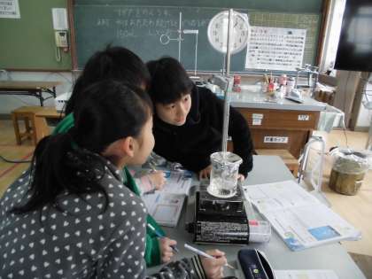水はあたためつづけると,どうなるのかをめあてに実験をしました。ビーカーの水を1分ごとに温めながら,15分間様子を観察しました。温度も記録し,ビーカーの底の泡の大きさや沸騰石の動きなどにも着目することができました。100度前後の沸騰した状態になると,「沸騰石が踊ってるみたい〜!」「ピョンピョンはねてる!!」と嬉しそうに子どもたち同士で話していました。