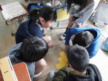 算数科で『変わり方』の授業が進んでいます。今日のめあては「だんの数が変わるとまわりの長さがどのように変わるのか調べよう。」でした。正方形の紙を並べて,その結果をもとに表を完成させていきました。