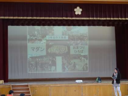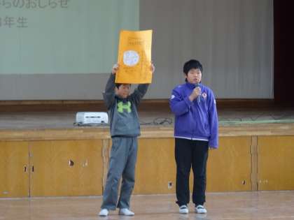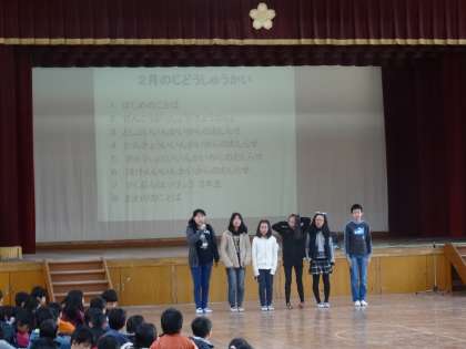 2月の児童集会がありました。最初は,『6年生を送る会』で歌う全校合唱の練習をした後,各委員会からの連絡がありました。そのあとは,3年生の作文発表です。