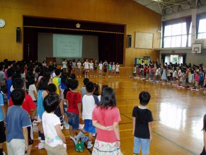 今朝,始業前に児童集会が行われました。高学年の児童は,自分の班に所属する低学年児童を教室まで迎えに行き,班毎に整列して始まりを待ちました。各委員会からの「お知らせ」の後に,全校で歌を歌い,1週間のスタートを切りました。