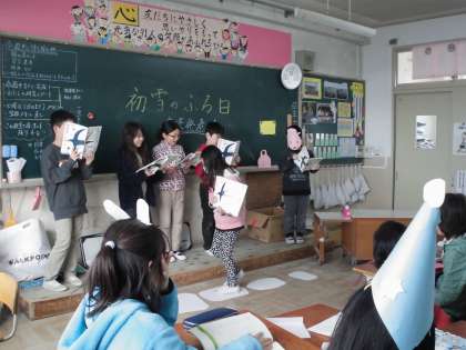 国語科『初雪のふる日』の音読発表会をしました。4つの場面に分かれて,読み進めました。練習の成果もあって、各場面ごとに音読の様々な工夫が見られました。