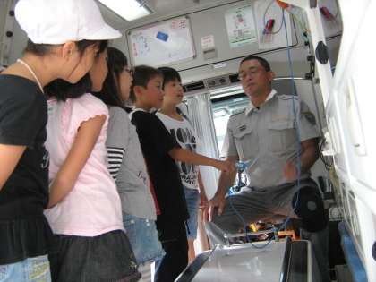4年生は社会の学習で,淀消防出張所へ見学に行きました。署員の方々が,仕事の内容を詳しく説明してくださったり,消防車や救急車の機能を教えてくださったりしました。