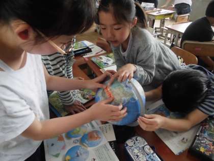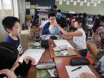 今日は社会科の『世界の中の国土』で地球儀を使って学習をしました。大陸の位置,海洋などシールを貼りながら位置を確かめました。
