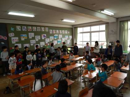 今日は,6年生から1年生へよろしくのあいさつをしに1年生の教室へ行きました。