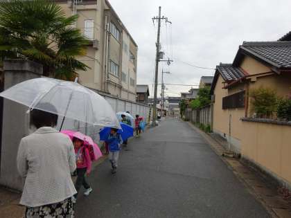 今日は,あいにくの小雨模様です。 登校班の様子をみると,班長を先頭に,上手に歩いていました。
