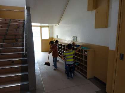 掃除時間の様子です。 一年生が,自分たちの下駄箱の前を掃除していました。