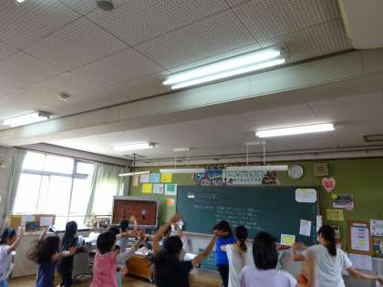 準備運動の係の子ども達が,運動会の全校ダンスの練習をしていました。