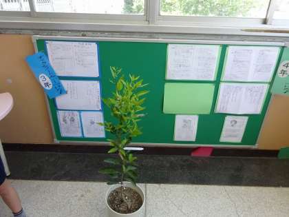 3年生の教室前の廊下には,デコポンの苗木があります。