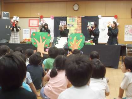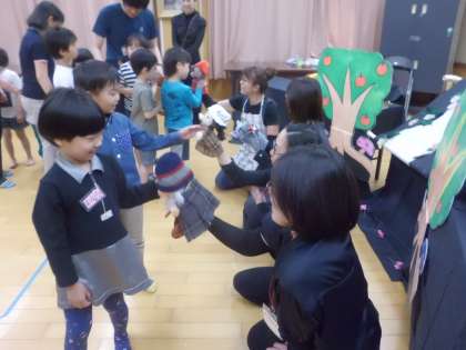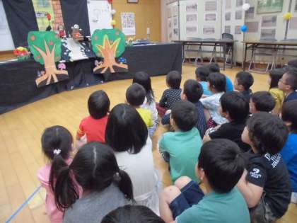 よんでよんさんが「赤ずきんちゃん」の人形劇を見せてくれました。