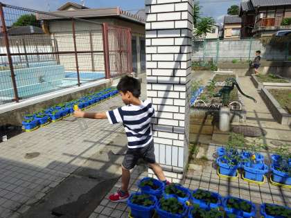 各学年の子ども達が,水やりに来ています。