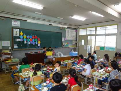 0531 給食の様子 公開日 2017/06/01 更新日 2017/06/01 学校の様子 1年生の給食の様子です。 献立を大きな声で読み上げています。 その時に,食器を机の上のどの場所に置くのかも確認しています。