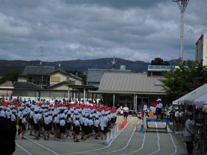 開会式では,音楽部の演奏で入場行進したあと,1年生のかわいらしい「はじめの言葉」で始まり,校歌斉唱,優勝旗返還,校長先生の言葉,応援団長選手宣誓そして準備運動と続きました。応援エール交換のあと,いよいよ競技が開始されます。