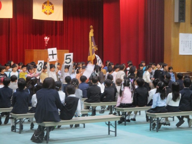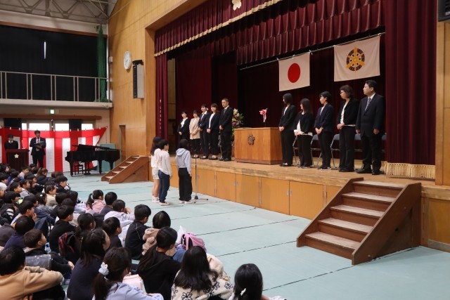 着任式では、新しく着任した教職員を前に、校歌を全校児童で歌いました。元気で明るい歌声に、体育館全体がパッと華やぎました。児童代表の6年生のお迎えの言葉もとても立派で感動しました。