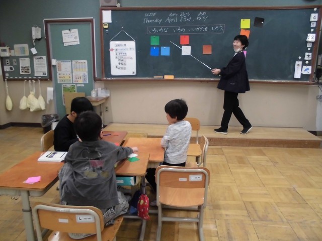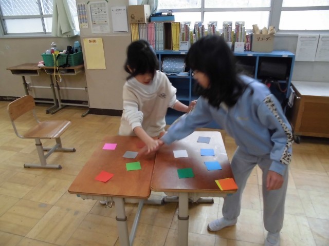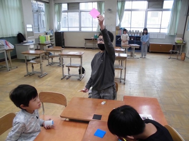 いろいろな色を英語で言うとどのような言い方になるのかを、絵本を使って学習しました。その後にグループに分かれて、みんなで色かるたをしました。先生が英語で言った色を聞いて、「これだー!」「グレーって何色?」と言いながら、楽しく色の言い方を学習しました。