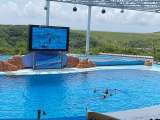 イルカショー満喫しています。 テーマはスマイル。 イルカたちとトレーナーの息のあ...