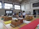 体育館では,バドミントン部が活動をしています。 ステージでは,音楽部が合奏の練習...