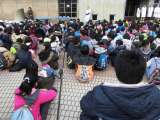 たくさんのみなさんの応援をうけ,いよいよスタートしました。 競馬場の中の...
