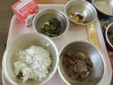 4月23日(木)の献立は, ・麦ごはん ・牛乳 ・牛丼(具) ・五目煮豆 ・だ...