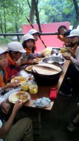 今夜の食事は,自分たちで作るカレーライスです。説明を聞いた後,火をおこしたり,...
