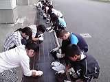 青少年自然の家へ戻り,焼き杉板にトライしています。バーナーで杉板を焼き,新聞紙で...