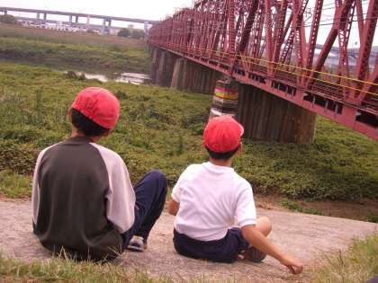 合同運動会へむけて,堤防沿いを赤い橋のところまで走っています。橋のところまで,一度も止まらずに走ります!よ〜い,どん!