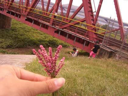 橋のところでは,通る電車に手を振ったり,お花を摘んだりして休憩しました♪ピンクのお花は,子どもたちからのプレゼント☆彡小さくてかわいいお花が沢山ついたきれいなお花でした。