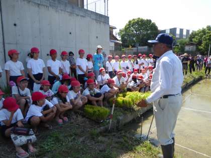 今年も社会福祉協議会の皆様にご支援いただいて,5年生が田植体験を行いました。