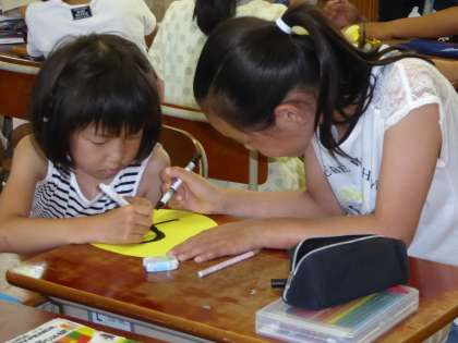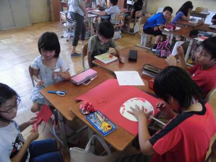 自己紹介し,縦割りグループ用の名札を作ったり,集合するときの目印となるうちわつくりをしました。