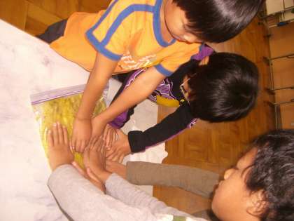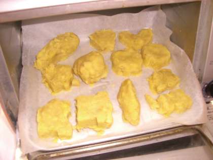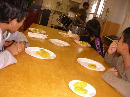 芋ほりで掘ったお芋を使って,みんなで力をあわせてスイートポテトを作りました!芋をつぶして,材料を混ぜて,好きな形に型抜きます。卵黄をハケで塗って,トースターに投入・・・・「チーン!」と,焼きあがりました!オンリーワンのスイートポテト。みんなでおいしくいただきました☆